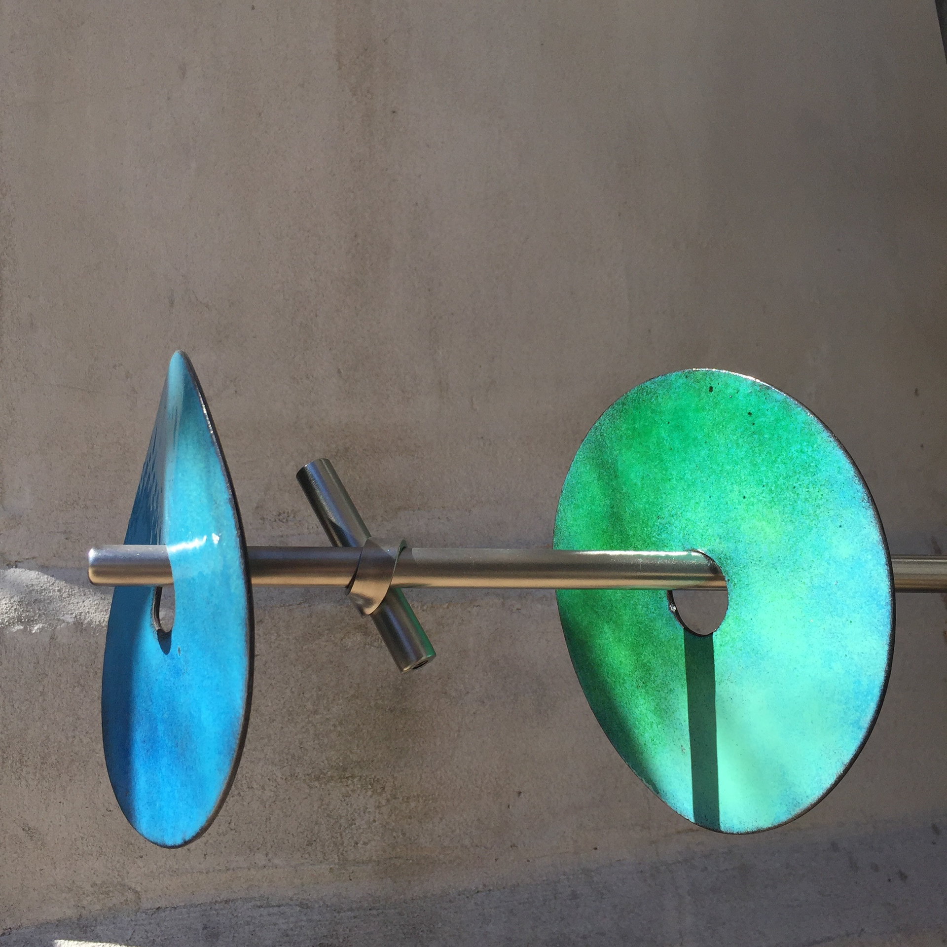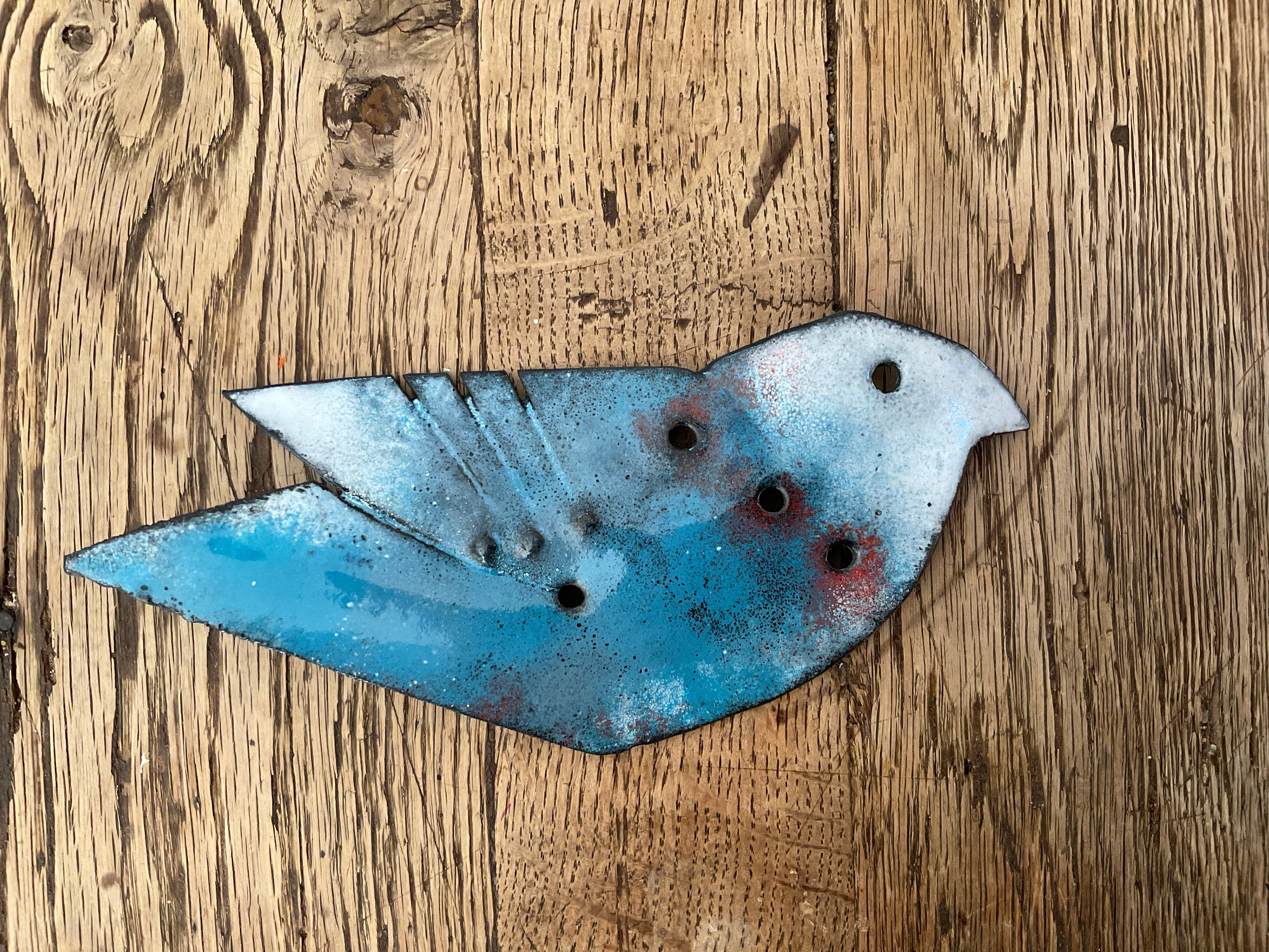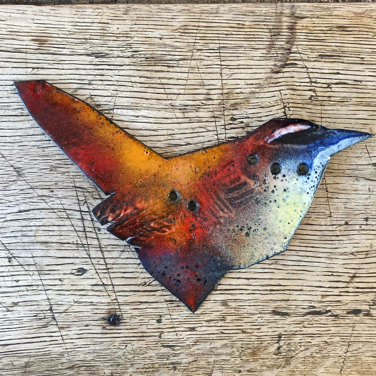 Vitreous enamels on steel and copper. Torch-fired. With Tsetso on the hammer and Margot on the torch.